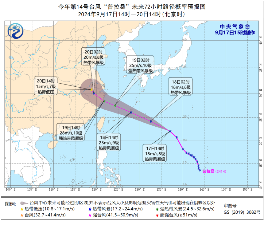 14号台风“普拉桑”则在9月15日生成,预计将于19日下午到晚上登陆浙江沿海(强热带风暴级)。