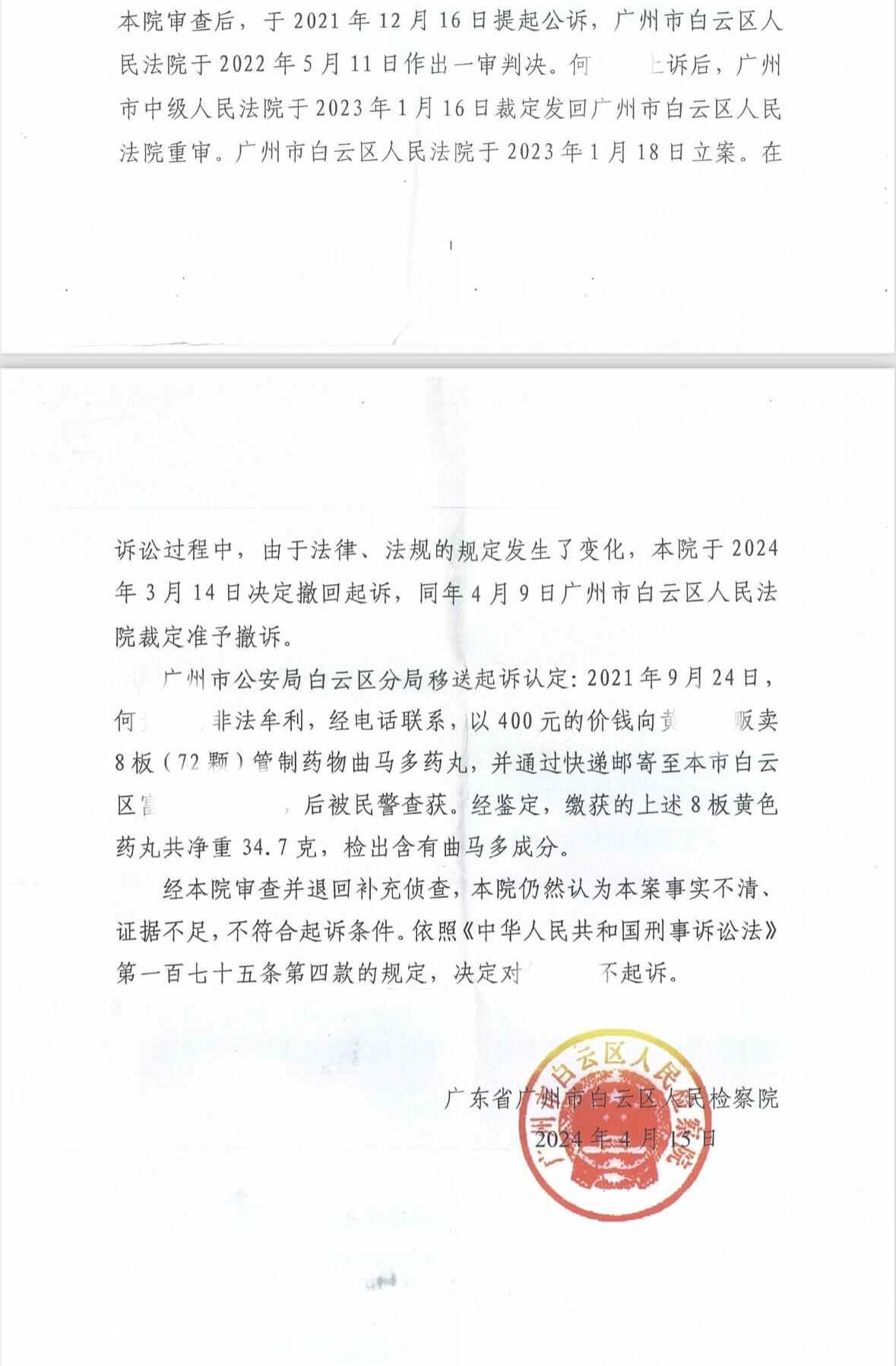 2021年10月,他因涉嫌贩卖毒品罪被广州市公安局白云分局抓获,之后被提起公诉。检方认为,何东通过其药房购入处方药复方曲马多片后,在购买人没有提供处方的情况下,为牟利向一吸毒人员及其推荐的朋友出售该药品,应当以贩卖毒品罪追究其刑责。