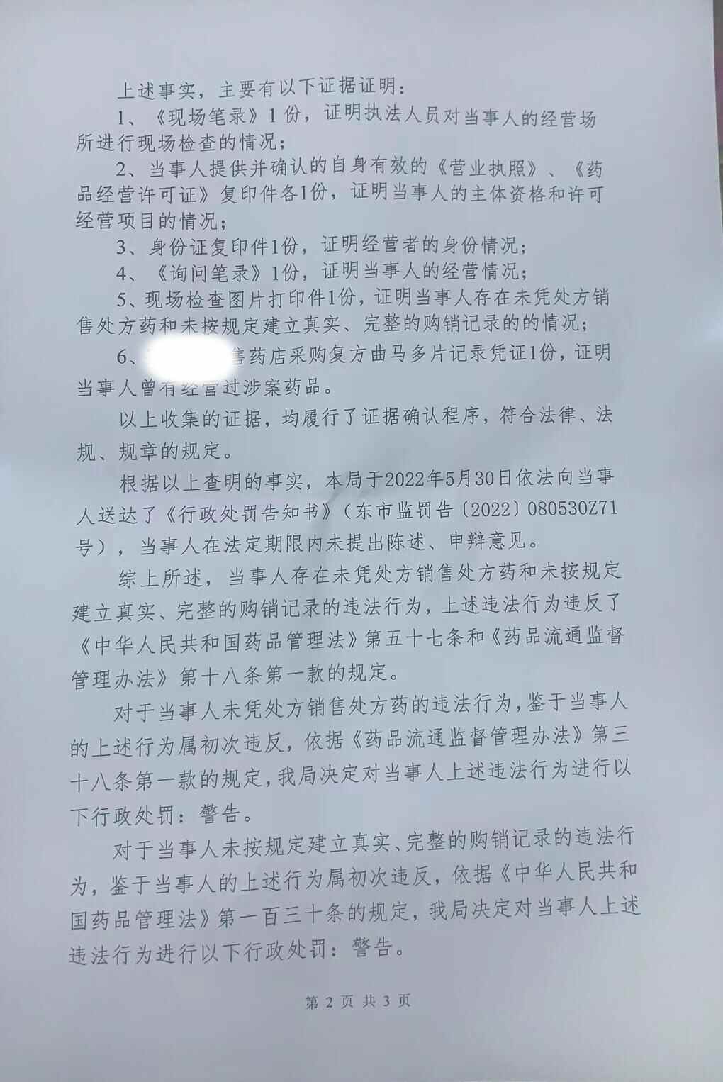 2022年6月,东莞市市场监督管理局作出的《行政处罚决定书》显示,2022年4月,该局执法人员到何东经营的药房检查。经核查得知,何东于2021年1月至2021年9月曾购买过复方曲马多片,但执法人员现场查阅当事人的药品购销系统,均没有显示相关上述复方曲马多片的购销信息,同时何东现场未能出示销售上述处方药复方曲马多的处方凭证和相关处方销售登记。经查证,何东在购销复方曲马多片时,未按照规定进行记录,同时销售复方曲马多片时,未向顾客索取并留存相关处方凭证且未做相关登记,即当事人存在未凭处方销售处方药和未按照规定建立真实、完整的购销记录的违法行为。鉴于当事人的上述行为属初次违反,依据《药品流通监督管理办法》第三十八条第一款的规定,决定对当事人上述行为进行行政处罚:警告。