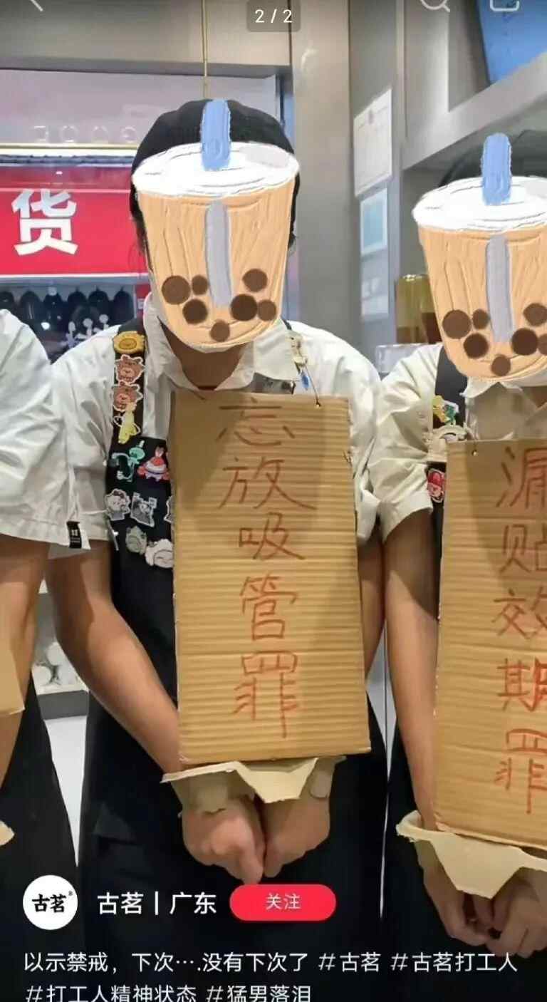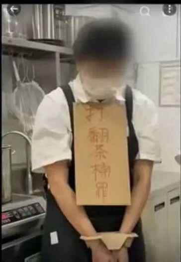 此前,网络流传的视频显示,奶茶店内,三名员工手上戴着“杯托镣铐”,脖子上挂着“谢罪牌”,牌子上写着“我有罪,不放吸管罪、不放坚果罪、不放盖子罪”“漏放吸管罪”“打翻茶桶罪”“漏贴(有)效期罪”等内容。