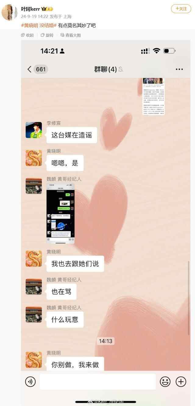 新恋人叶珂也发微博回应没结婚的话题,晒黄晓明与团队聊天记录称“有点莫名奇妙了”。