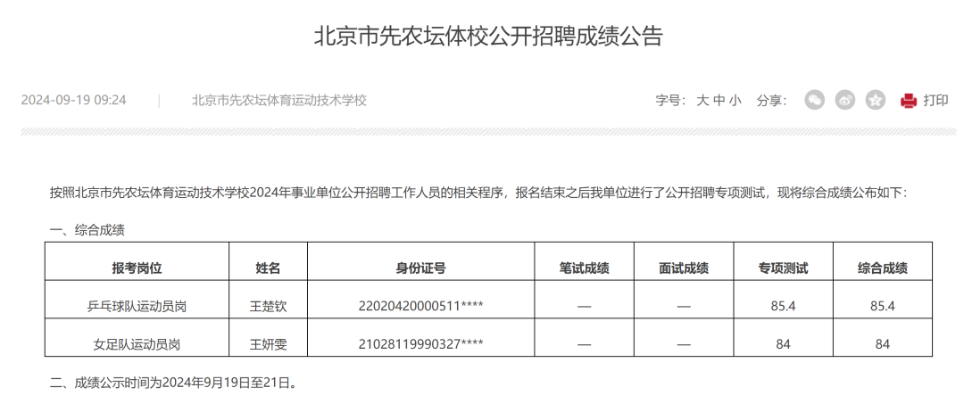 9月19日,北京市先农坛体校发布了2024年公开招聘成绩公告。公告显示,乒乓球队运动员岗报考者为王楚钦,综合成绩为85.4分(总分100分)。女足队运动员岗报考者为王妍雯,综合成绩为84分。
