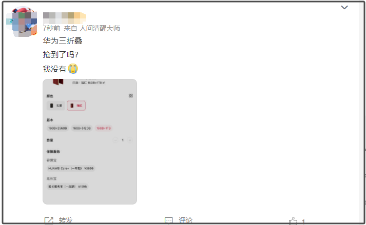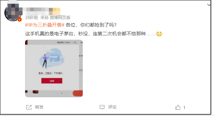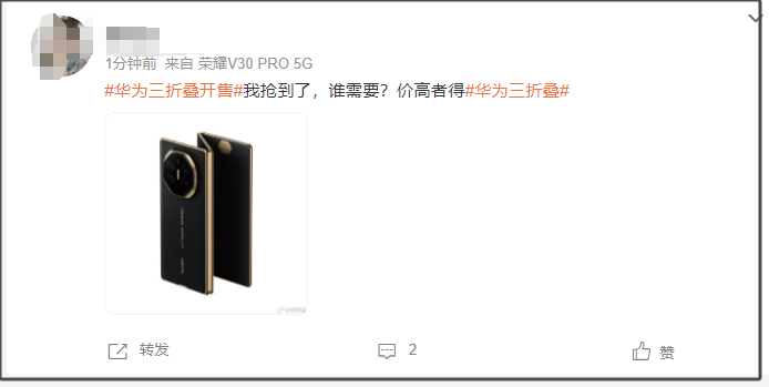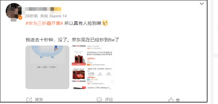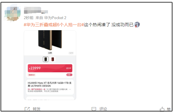 9月20日10:08,华为新款三折叠手机HUAWEI Mate XT非凡大师正式开售,同一用户仅限购买一台。开始抢购后,Mate XT 非凡大师全部型号迅速售罄。目前官网渠道已无货。