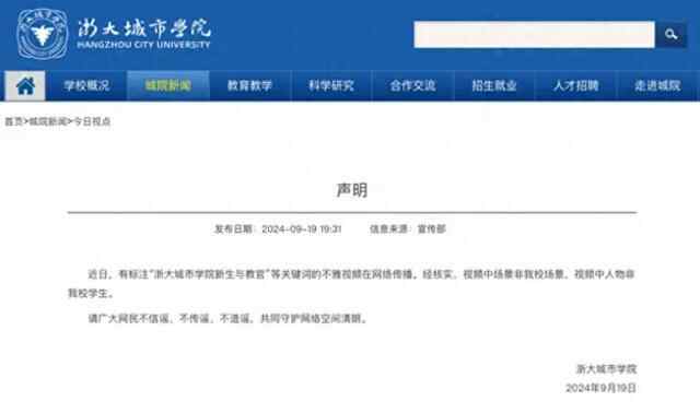 9月19日,浙大城市学院发布声明:近日,有标注“浙大城市学院新生与教官”等关键词的不雅视频在网络传播。经核实,视频中场景非我校场景,视频中人物非我校学生。