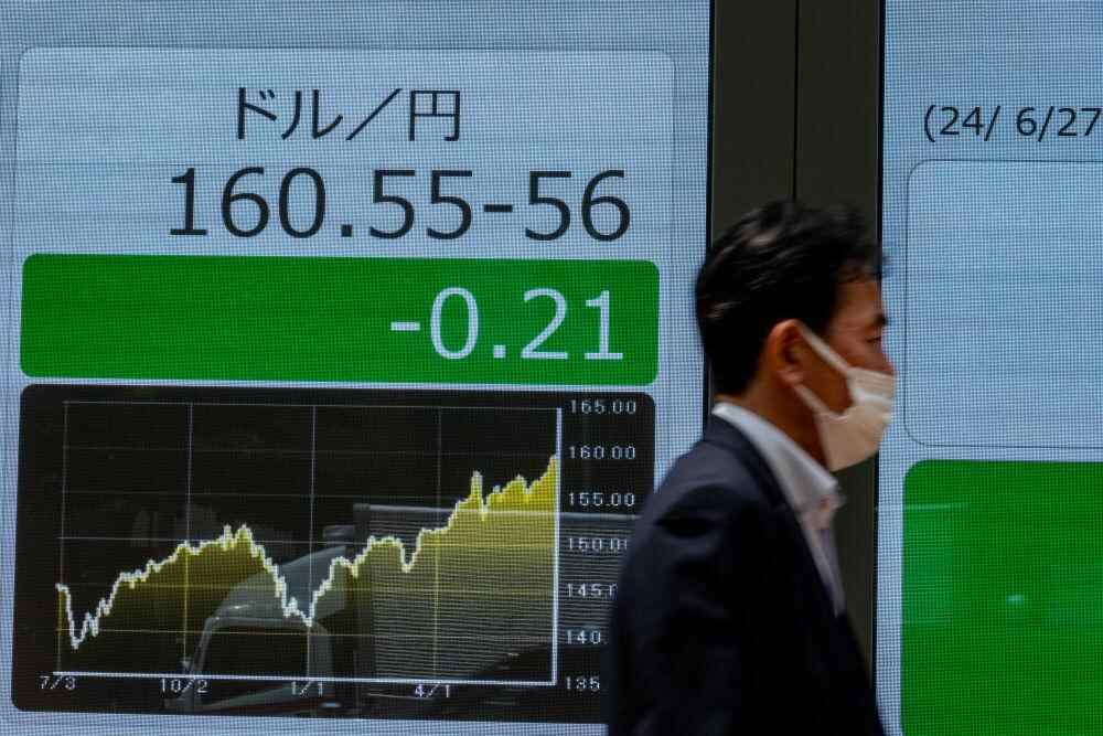 6月27日,行人走过日本东京一处显示实时汇率的电子屏幕。新华社记者张笑宇摄