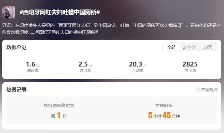 9月20日,微博话题“西班牙网红夫妇吐槽中国厕所”登顶热搜榜,引起网友关注和热议。
