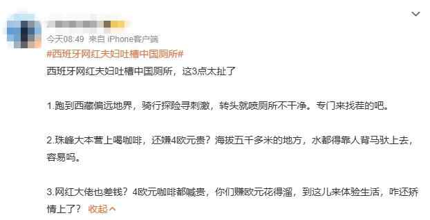 据媒体报道,近日,一对西班牙网红夫妇来到中国西藏旅行,并拍摄视频。在视频中,这对夫妇吐槽喜马拉雅自然保护区咖啡太贵,一杯要4欧元。此外,还称中国的厕所让人惊讶:“每个人的排泄物都在下面流动!太无语了。”