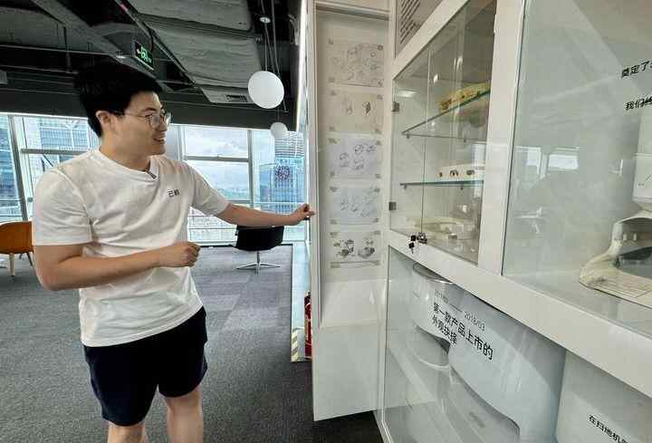 2024年8月20日,在位于深圳的云鲸总部,张峻彬向记者介绍云鲸扫拖机器人的研发过程。新华社记者 毛思倩 摄