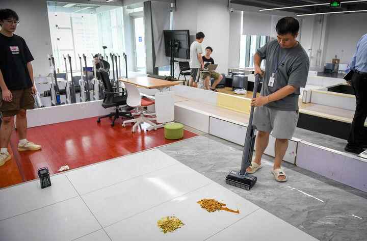 2024年8月20日,在位于深圳云鲸总部的功能测试实验室,工作人员测试云鲸智能洗地机的性能。新华社记者 毛思倩 摄