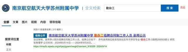 不过,南航苏州附中官网“勤杂工”检索结果提供的《南京航空航天大学苏州附属中学 勤杂工临聘合同制工作人员 录用公示》预览信息中,仍披露了与网传截图一致的公示信息。此外,苏州工业园区教育网关于“勤杂工”的检索结果预览信息,也同样披露了相关公示信息。