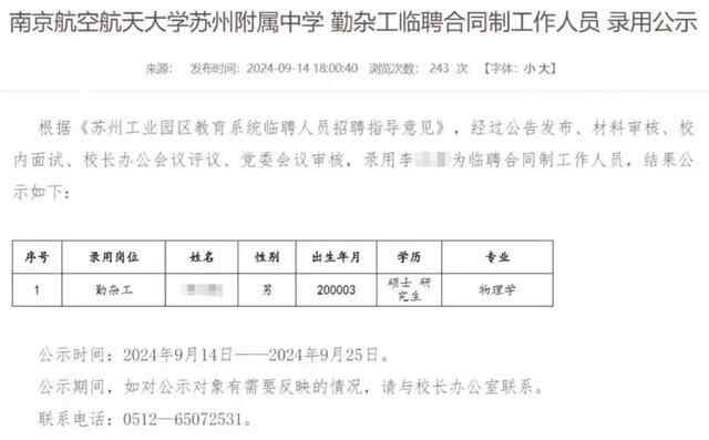 近日,一则“南航苏州附属中学勤杂工临聘合同制工作人员的录用公示”获披露,该公示信息显示,一名24岁物理学研究生拟被聘为该中学勤杂工。