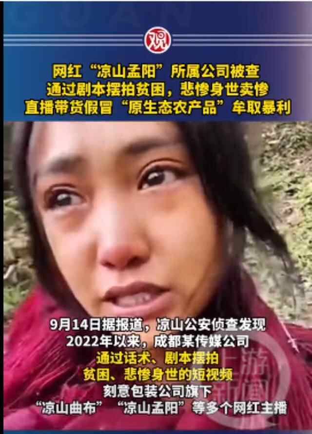 凭借“父母双亡、辍学养家”的悲情人设走红的“凉山孟阳”,一度拥有365万余粉丝,当地公安调查后发现,这个账号是精心孵化的卖惨网红之一,销售大量假冒产品,非法牟利超1000万元。经查自2021年以来,唐某等人注册公司,雇佣郭某等人,通过话术、剧本摆拍悲惨身世短视频、打造虚假人设,包装孵化旗下“凉山孟阳”“凉山阿泽”等网红主播。然后,以“助农”为噱头,低价购入非凉山农副产品,贴上“大凉山”商品属性,直播带货假冒大凉山原生态农特产品,销售额超3000万元,非法牟利超1000万元。据悉,昭觉县人民法院已对“凉山孟阳”“凉山阿泽”案一审宣判,一共有8人因虚假广告罪被判刑。