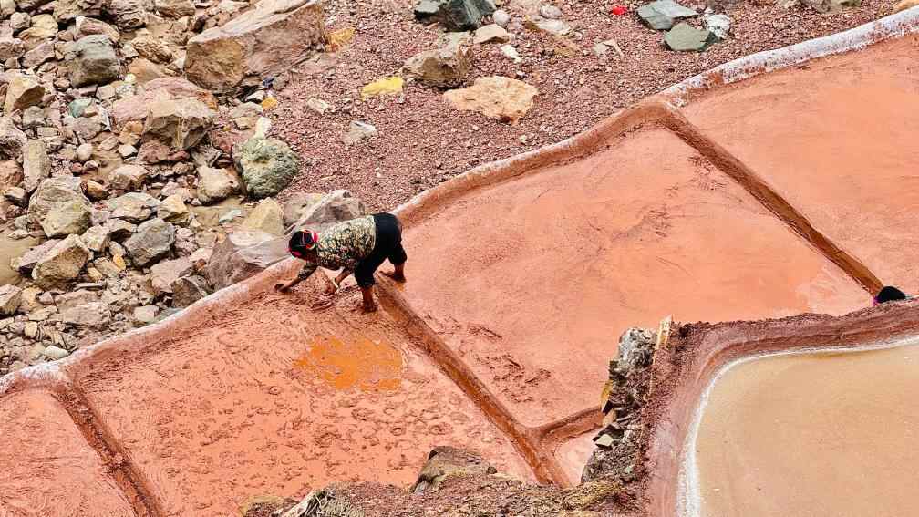 当前是盐田修补季。盐田底部涂有一种红土,卤水在田上蒸发,并部分下渗形成盐柱。红土须每年更换,否则卤水会全部下渗,颗粒无收。