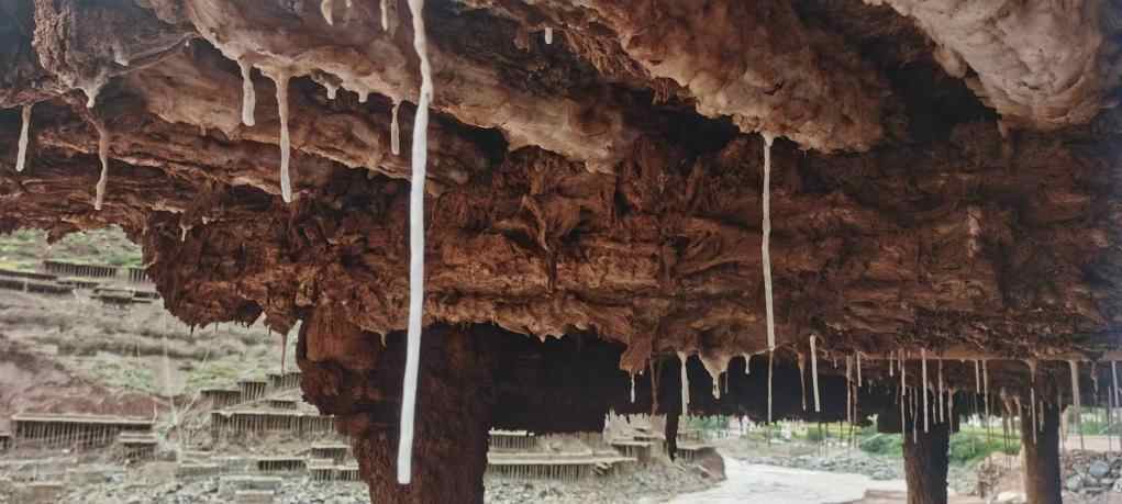 田下的盐棚,俨然溶洞。低矮幽暗的盐棚用西藏柏木架成,梁上挂满盐花,垂下的盐柱宛如冰锥,盐柱下方有滴卤结晶形成的盐笋。