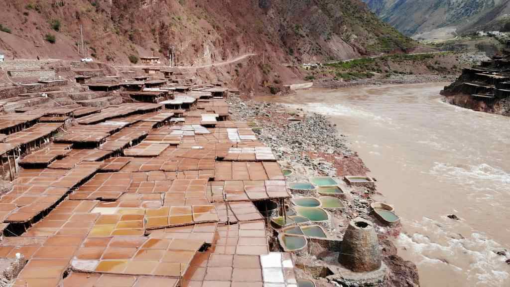 一块块盐田横连纵叠。在矿物质和微生物作用下,盐卤呈现不同颜色,仿佛山坡上的“调色盘”。