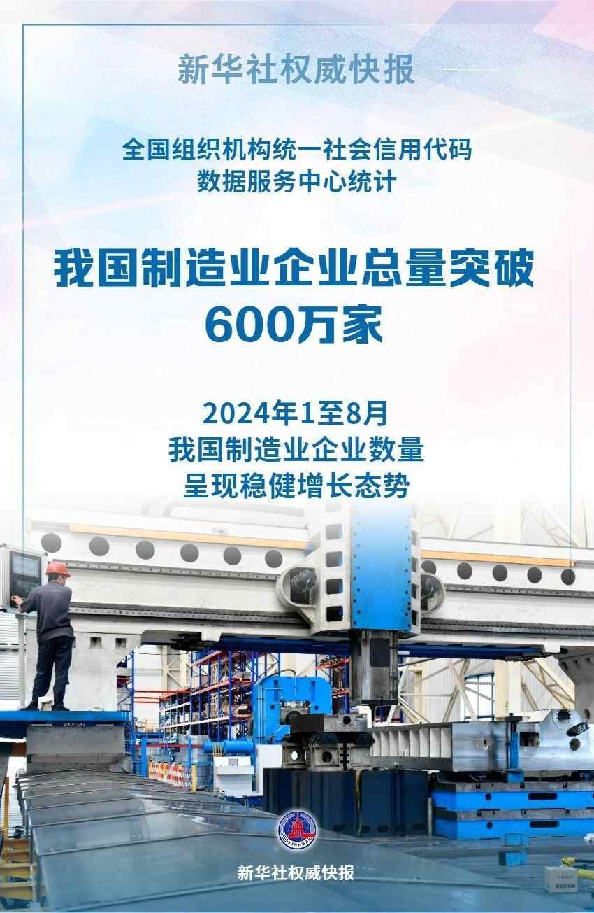 全国组织机构统一社会信用代码数据服务中心统计数据显示,我国制造业企业总量突破600万家。2024年1至8月,我国制造业企业数量呈现稳健增长态势,截至2024年8月31日,我国制造业企业总量达到603万家,与2023年底相比增长5.53%。其中与战略性新兴产业有关的企业达到51.53万家,占制造业企业总量的8.55%,与2023年底相比增长6.35%。