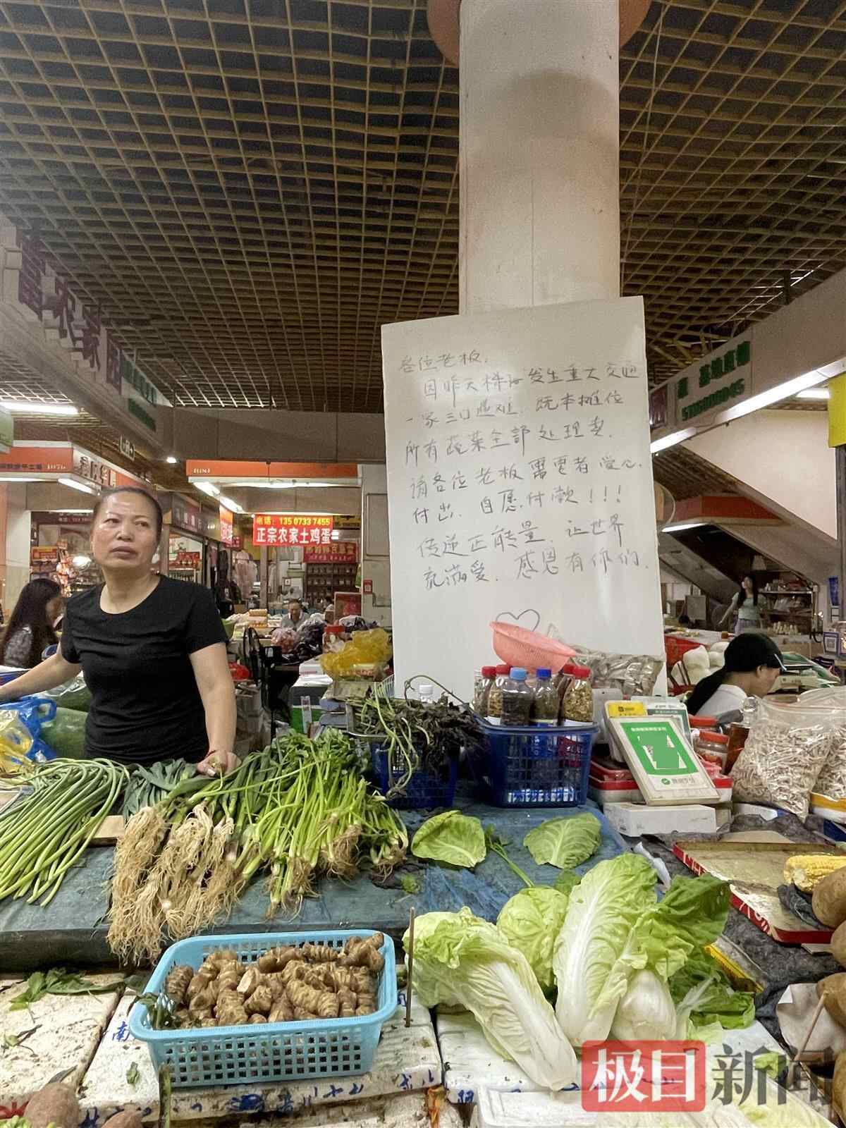 “因昨天株洲发生重大交通事故,一家三口遇难,既本摊位所有蔬菜全部处理卖,请各位老板需要者爱心付出,自愿付款!!!”9月24日,极目新闻记者来到位于芦淞大桥附近的菜市场,遇难者的菜摊上摆放着一个大大的告示,附近围满了顾客,两名年轻女子和一名男子在帮忙叫卖。
