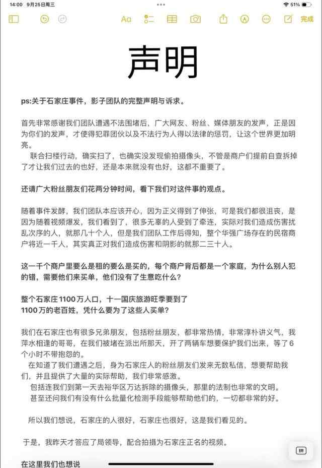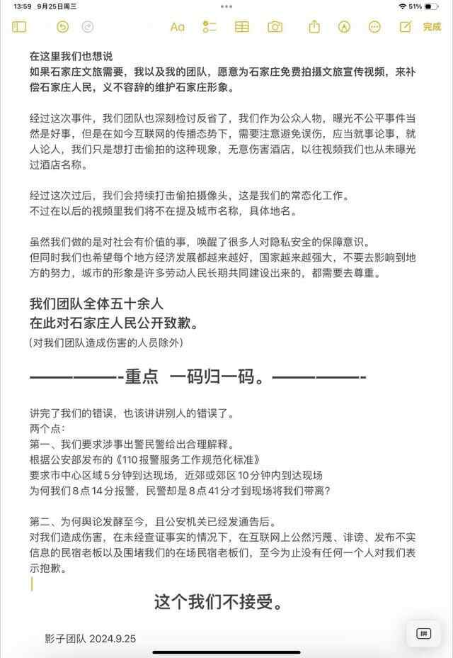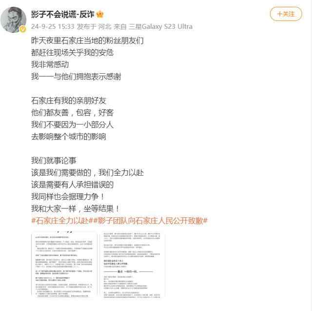 9月25日15时许,博主“影子不会说谎”发布了关于石家庄事件的回应声明。声明中说道:“如果石家庄文旅需要,我以及我的团队,愿意为石家庄免费拍摄文旅宣传视频,来补偿石家庄人民,义不容辞地维护石家庄形象”,“我们团队全体五十余人在此对石家庄人民公开致歉”。