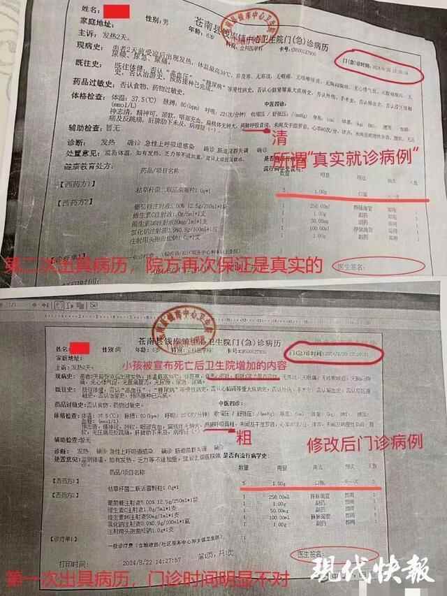 苏先生告诉记者,8月23日前后,苍南县卫健局工作人员曾向其承诺,病历绝无修改。“我没拿出两份不同病历前,他们始终不承认有修改行为。”对于病历前后变化,苍南县卫健局解释称,就诊医院可以对病历内容进行补充,补充部分即为“伴恶心呕吐,呕吐物1次为胃内容物”。但并未就前后两份病历中“两肺呼吸音清”和“两肺呼吸音粗”的变动作出说明。