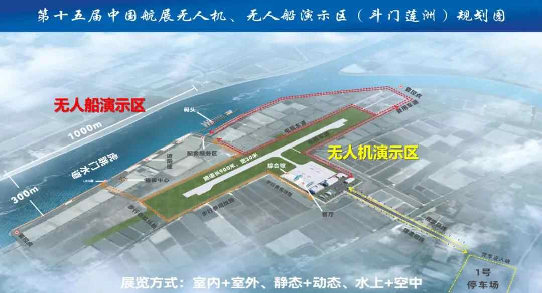 为了顺应无人系统迅速发展的趋势,本届航展首次开辟专门展示无人机、无人船、无人系统的“第二展区”。该“第二展区”所在的珠海莲洲通用机场和虎跳门水道的位置、条件得天独厚,既有900米跑道、停机坪、现有保障设施,也有宽350米左右、深约4.5米的航道。为了方便观众在这里观看表演,珠海市结合了百年一遇防洪工程,专门修建了1公里的看台,并新建了展示码头,为无人机、无人船的展示提供充足的空间。