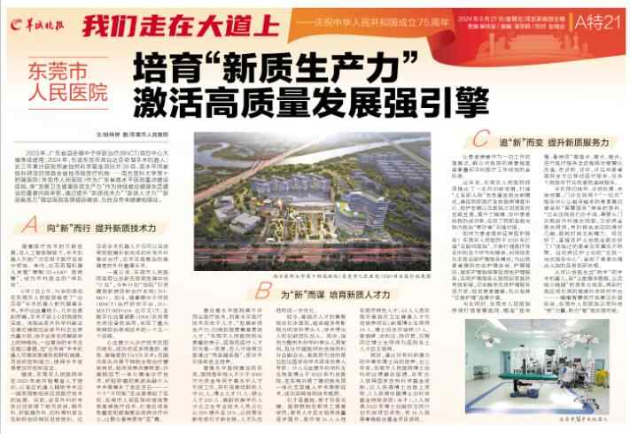 2023年,广东省首座硼中子俘获治疗(BNCT)项目中心大楼落成使用;2024年,引进东莞市首台达芬奇Ⅺ手术机器人;近三年累计获批国家自然科学基金项目共39项,高水平国家级科研项目领跑全省地市级医疗机构……南方医科大学第十附属医院(东莞市人民医院)作为广东省高水平医院重点建设医院,将“发展卫生健康新质生产力”作为持续推动健康东莞建设的重要内容来抓,通过提升“新质技术力”“新质人才力”“新质服务力”推动医院发展提质增效,为民众带来健康和福祉。