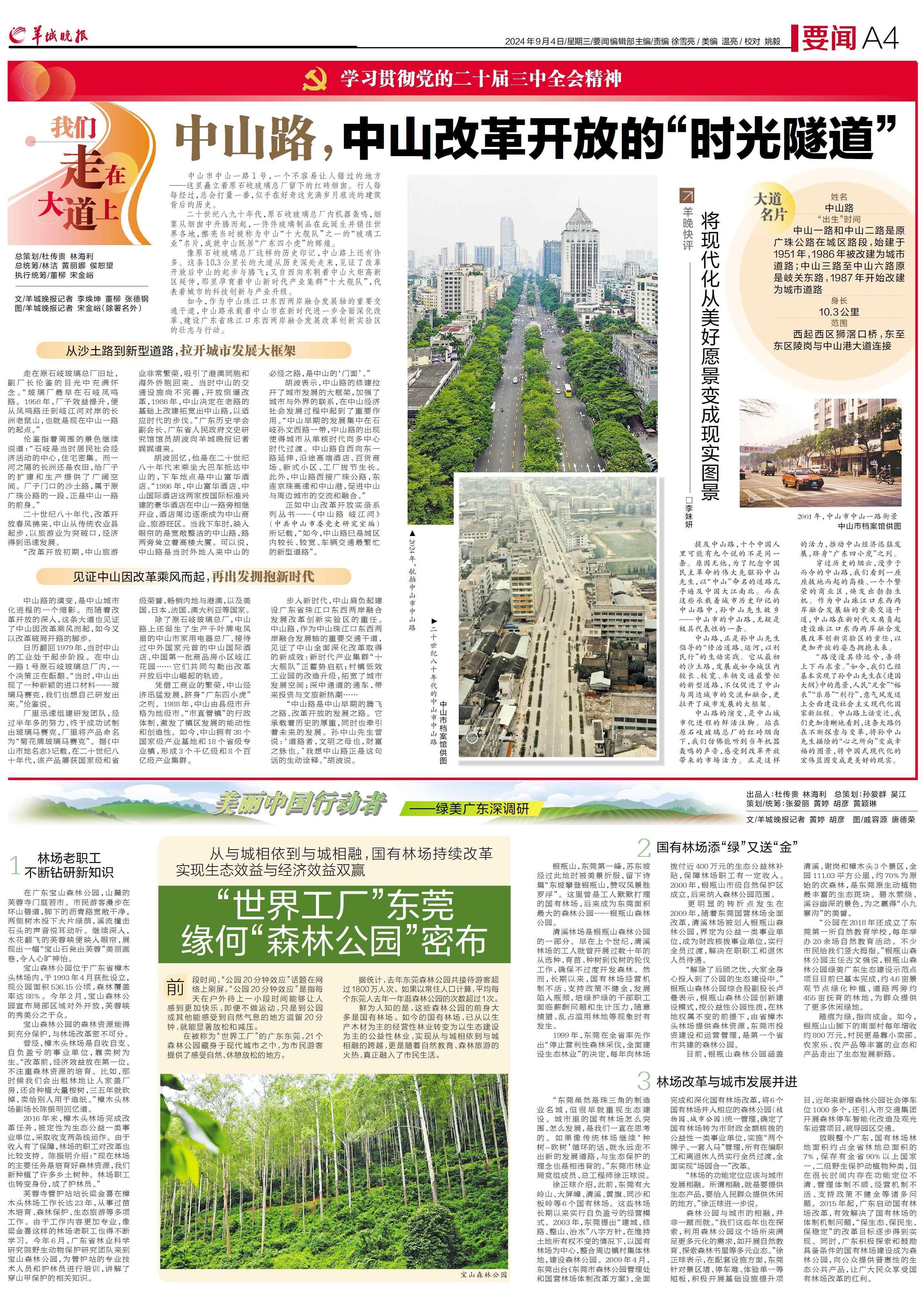 步入新时代,中山肩负起建设广东省珠江口东西两岸融合发展改革创新实验区的重任。中山路,作为中山珠江口东西两岸融合发展轴的重要交通干道,见证了中山全面深化改革取得的新成效:新时代产业集群“十大舰队”正蓄势启航;村镇低效工业园的改造升级,拓宽了城市发展空间;深中通道的通车,带来投资与文旅新热潮……