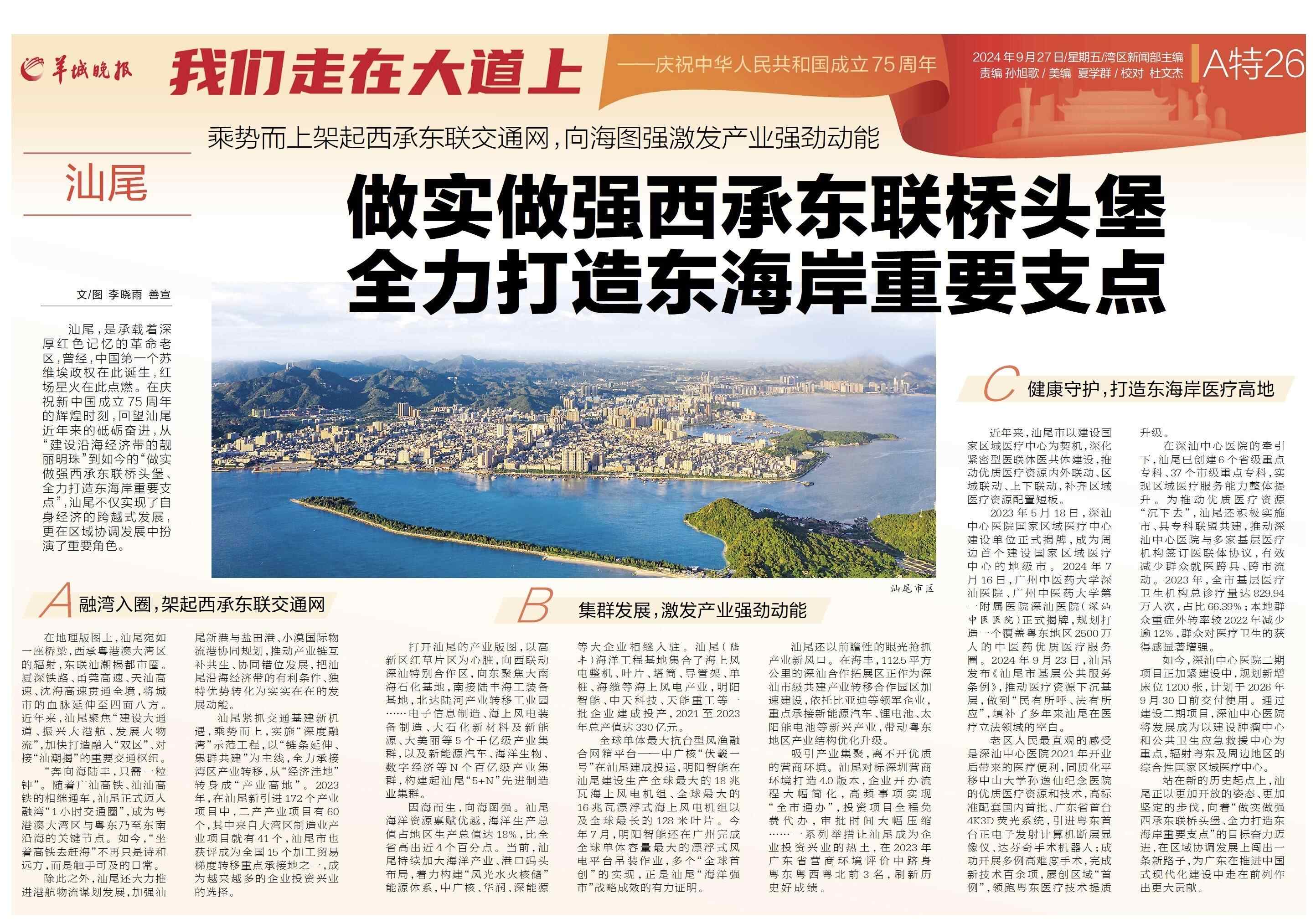 站在新的历史起点上,汕尾正以更加开放的姿态、更加坚定的步伐,向着“做实做强西承东联桥头堡、全力打造东海岸重要支点”的目标奋力迈进,在区域协调发展上闯出一条新路子,为广东在推进中国式现代化建设中走在前列作出更大贡献。