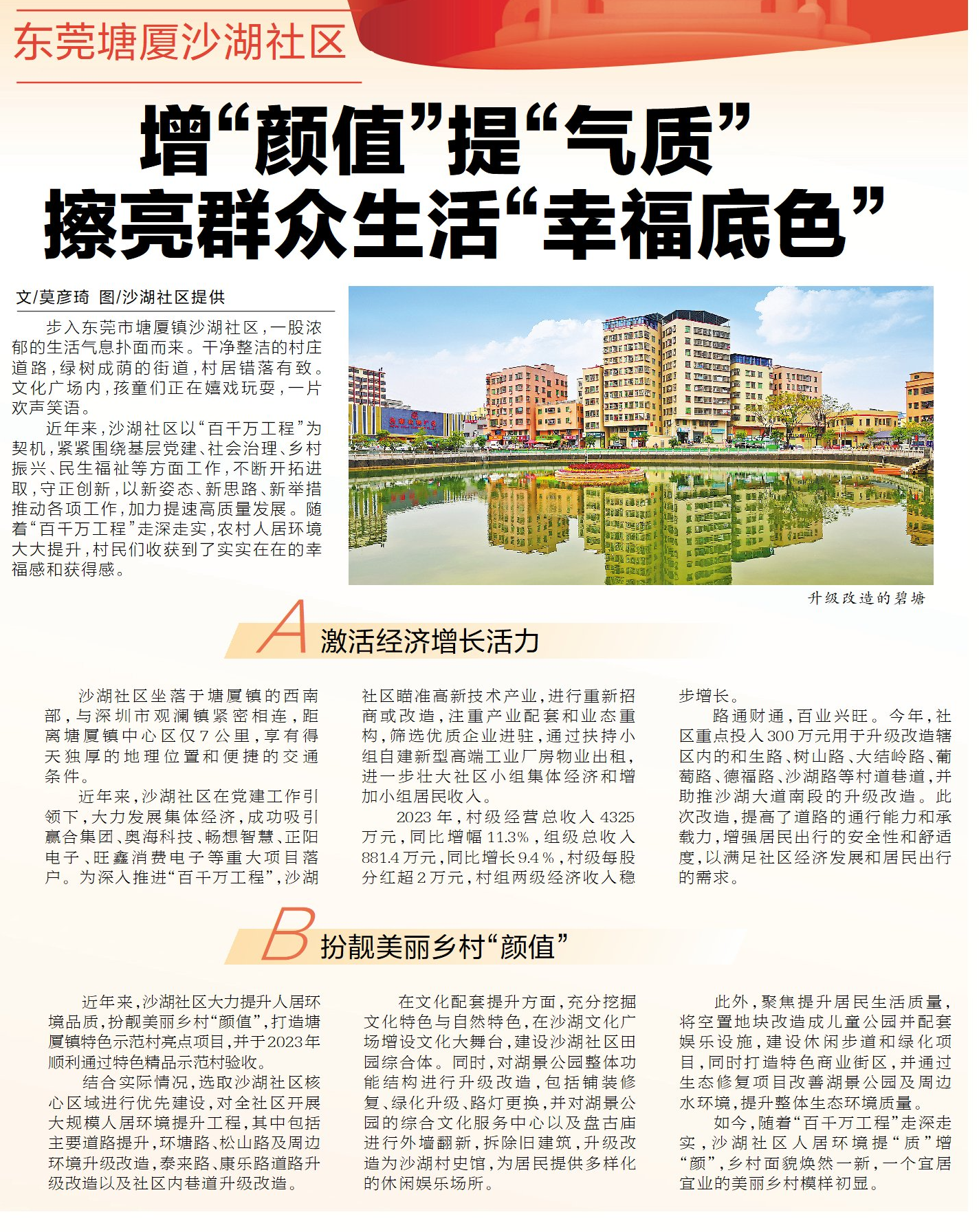 如今,随着“百千万工程”走深走实,沙湖社区人居环境提“质”增“颜”,乡村面貌焕然一新,一个宜居宜业的美丽乡村模样初显。