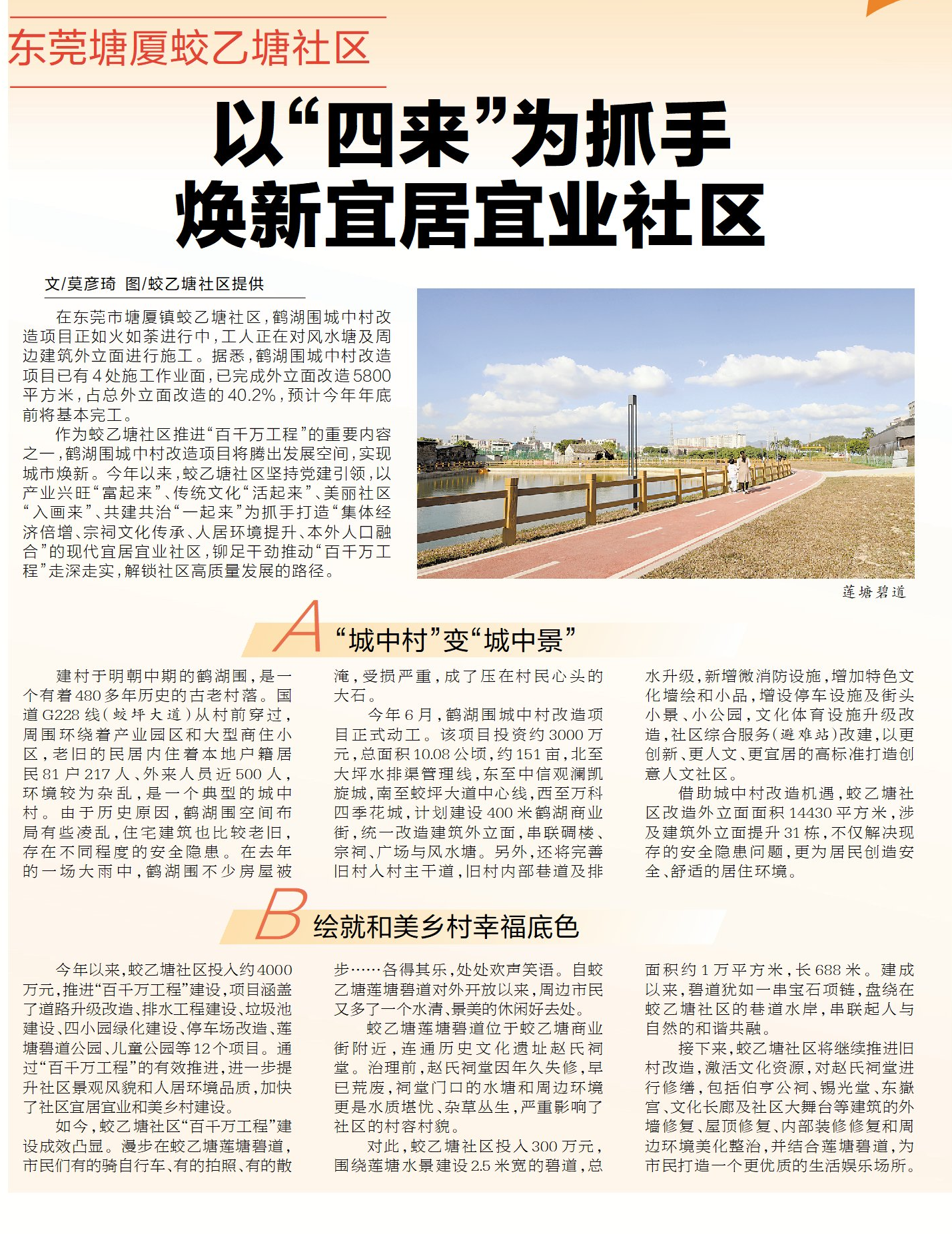 作为蛟乙塘社区推进“百千万工程”的重要内容之一,鹤湖围城中村改造项目将腾出发展空间,实现城市焕新。今年以来,蛟乙塘社区坚持党建引领,以产业兴旺“富起来”、传统文化“活起来”、美丽社区“入画来”、共建共治“一起来”为抓手打造“集体经济倍增、宗祠文化传承、人居环境提升、本外人口融合”的现代宜居宜业社区,铆足干劲推动“百千万工程”走深走实,解锁社区高质量发展的路径。