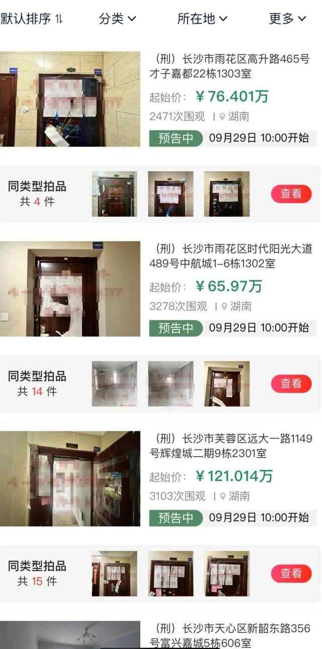 京东司法拍卖页面显示,天心区富兴嘉城有30个拍品,起拍价在78万余元至83万余元之间;雨花区才子嘉都7个拍品,起拍价格在74万余元至78万余元,芙蓉区辉煌城15 个拍品,起拍价格在92万余元至121万余元,雨花区中航城 15个拍品,起拍价在64万余元至68万余元,雨花区半山壹号 20个拍品,起拍价在102万余元至133万余元。