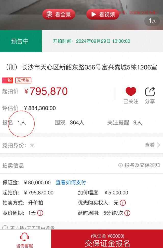 9月26日,待拍的87套房屋,一直没有人报名。截至9月27日中午12点,位于长沙市天心区富兴嘉城5栋1206室的房屋,显示有1人报名。上述房屋评估价为88.43万元,起拍价为79.587万元,保证金8万元,吸引了364人围观,9人设置提醒。