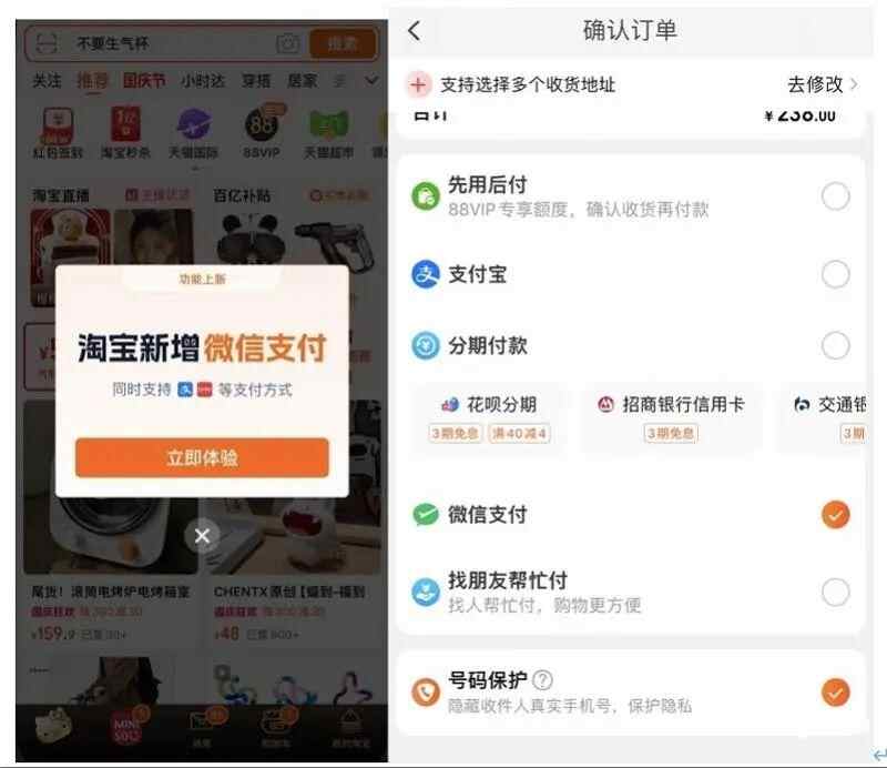 9月27日,众多网友发现,在淘宝购物可以使用微信支付来付款了。据网友体验,整个过程非常丝滑,丝毫无卡顿,更有不少网友打趣道:“再也不用帮爸妈淘宝代购了,他们也能自己用微信付款了。”