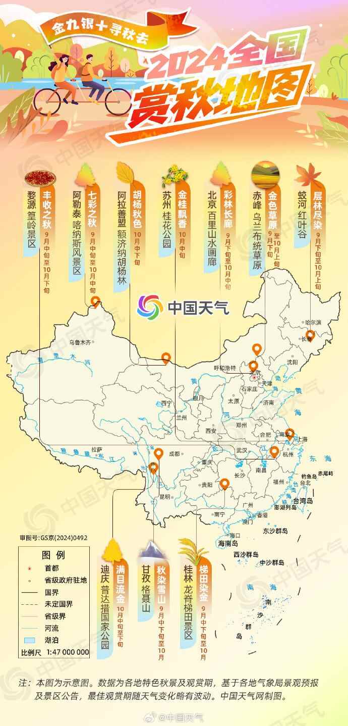 目前,我国北方大部秋意正浓,秋季最南端已抵达长江沿线。彩林装点下的雪山、金灿灿的胡杨林、香气馥郁的金桂,多地秋景进入最佳观赏期。国庆假期将至,不少小伙伴已经有了赏秋计划。收好这张2024全国赏秋地图,假期抽空去领略祖国南北的大好秋色吧!