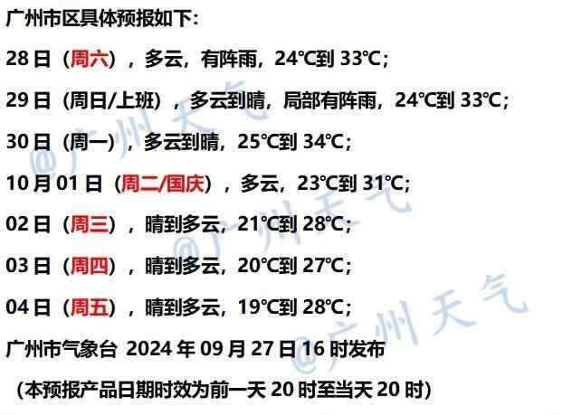 假期前广州天气情况如何?广州市气象台预计,28-29日受副高边缘气流和弱切变线影响,多云到晴为主,局部有(雷)阵雨;30日受副高反气旋环流控制,天气晴热。