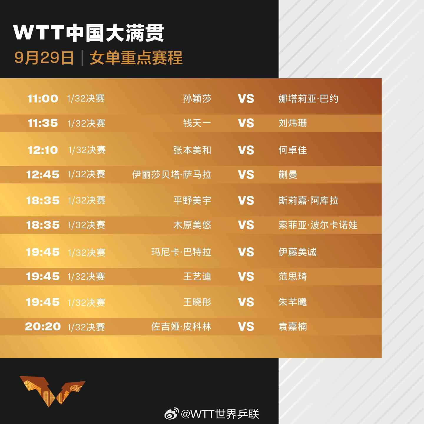 WTT中国大满贯赛今天(9月29日)正式打响,女单头号种子孙颖莎 、二号种子王曼昱分别镇守上、下半区,孙颖莎将在首轮对阵波兰选手娜塔莉亚·巴约,王曼昱和另一位中国选手石洵瑶将在首轮相遇。孙颖莎所在的半区还包括中国选手王艺迪,以及来自日本的伊藤美诚和平野美宇。
