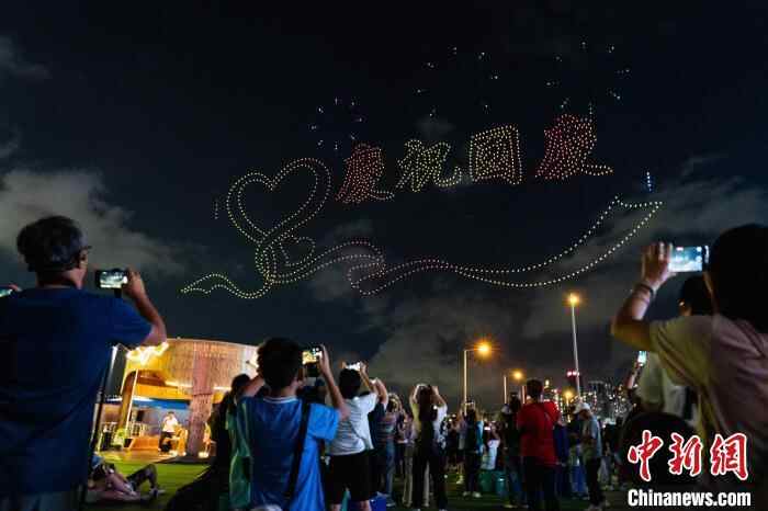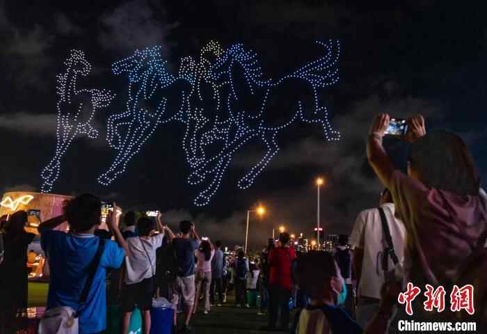 中新社香港9月28日电 (记者 刘大炜)夜幕降临,维多利亚港(维港)灯光璀璨,将香港衬托得更加迷人。28日晚,以维港夜空为幕,1500架无人机从香港湾仔海滨腾空而起,“奔马”“熊猫”“紫荆花”等图案相继在空中显现,伴随着流动的图案和变幻的造型,点缀香江之畔,吸引大批市民旅客观看“打卡”。