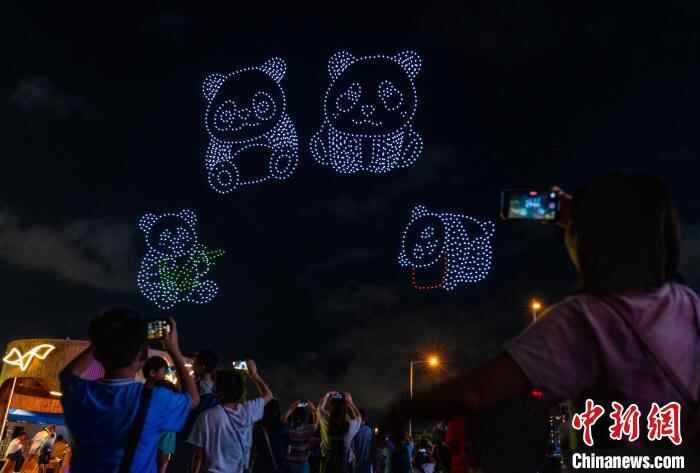 图为表现第三对中央政府赠港大熊猫和香港海洋公园新诞生的熊猫幼崽的无人机展示。 中新社记者 侯宇 摄