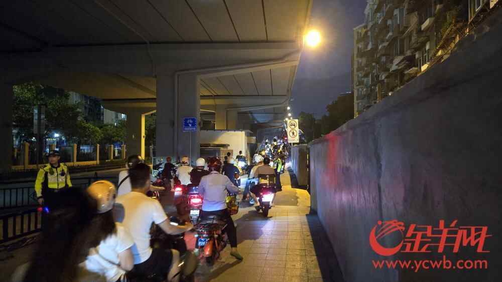9月27日晚,羊城晚报全媒体记者在现场看到,新开通的非机动车临时坡道位于松南路和金沙洲路的路口以西约50米处,在抵达坡道前约300米处,可看到有明显的指示牌告知非机动车车主过桥通道方向,沿途还有多名交警和志愿者驻守,引导非机动车有序上桥。