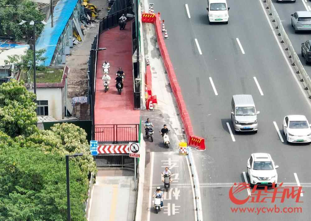 晚高峰时段,临时坡道入口处有两位交通警察执勤,对非机动车车流和过往行人进行引导。通道入口处,“非机动车道专用道”和“禁止机动车和行人上桥”的标识牌相当显著。“这条坡道是为非机动车专门开通的,原有的慢行道也依然允许通行。目前我们在大桥桥头设置了执勤岗位,劝阻非机动车从坡道上桥,避免与机动车抢道。”在临时坡道旁执勤的交警向羊城晚报全媒体记者表示。