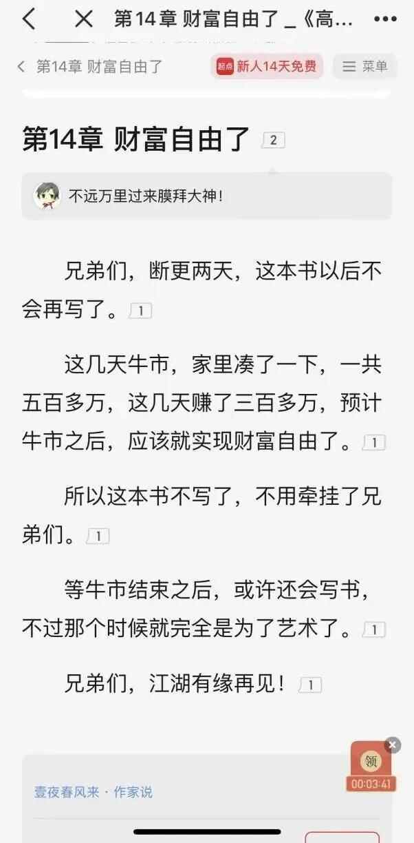 甚至有人几天前还在写网络小说赚钱,几天后就断更,称即将财富自由:“这几天牛市,家里凑了一下,一共五百多万,这几天赚了三百多万,预计牛市之后,应该就实现财富自由了。所以这本书就不写了。”