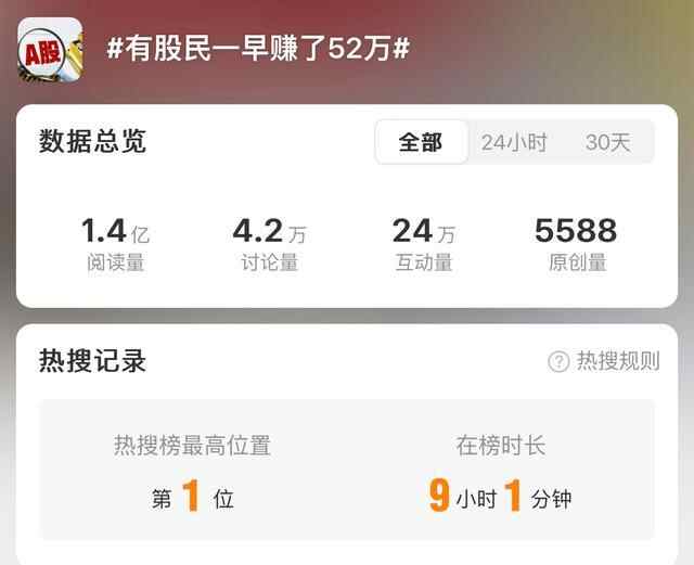 “有股民一早赚了52万”的消息传遍大街小巷,在微博热搜停留了9个小时,比股市交易的时间还多一倍。