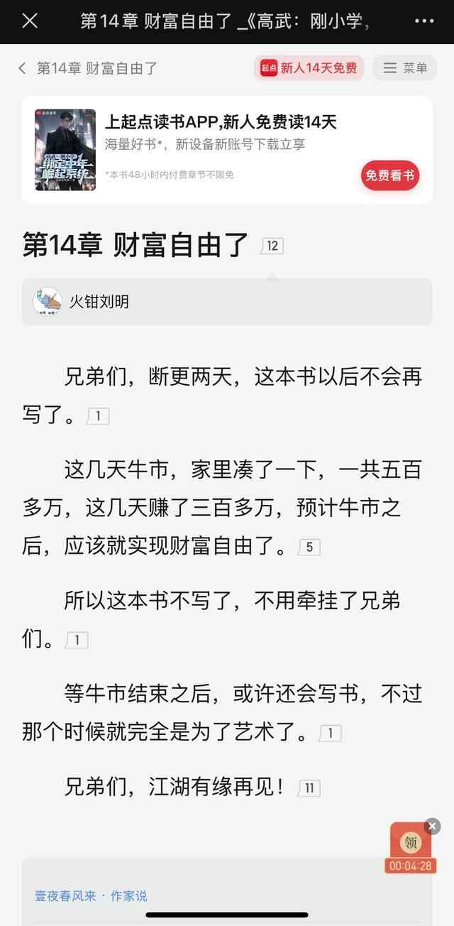 更有甚者,网络小说的作者直接“断更”:“这几天赚了三百多万,预计牛市之后,应该就实现财富自由了。所以这本书不写了,不用牵挂了兄弟们。”