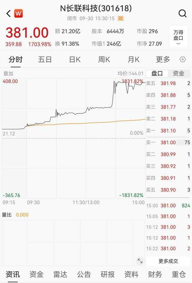 而赶在这一天上市的长联科技(301618.SZ)不仅以1703.98%的涨幅成为当日涨幅最高的股票,也创下今年来新股上市首日单日最大涨幅纪录。长联科技发行价为21.12元/股,当日以99元/股的价格开盘,盘中最高涨至408元/股,截至收盘报381元/股。若以中一签即500股计算,中签该股票的投资者持有该股至收盘,盈利约17.99万元。