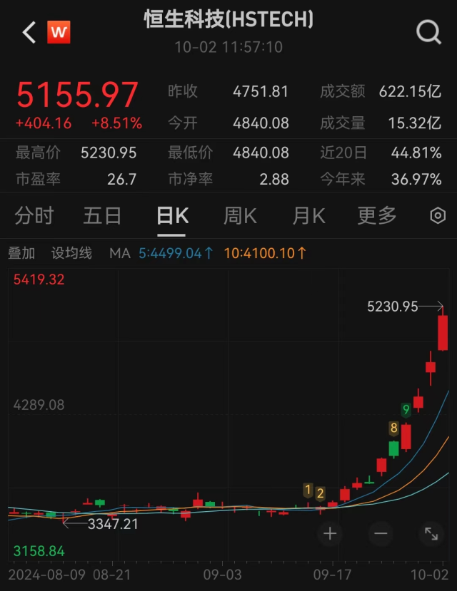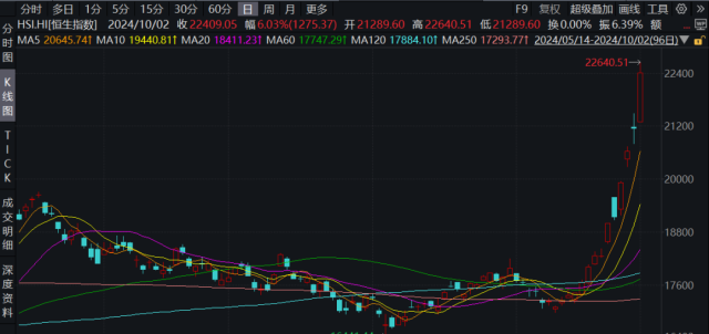 10月2日,港股三大指数放量大涨,恒指涨6%,刷新2023年1月以来高位;恒生科技指数一度大涨10%,午涨8.72%,创2022年2月以来新高。大市半日成交额2354亿港元。其中港股中资券商华融金控涨近400%,申万宏源香港大涨128%。