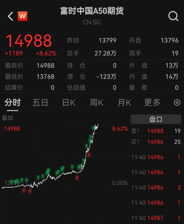 富时中国A50指数期货早盘直线拉升,截至北京时间约12:00,富时中国A50指数期货涨幅扩大至8%,逼近15000点,创2022年7月6日以来新高。