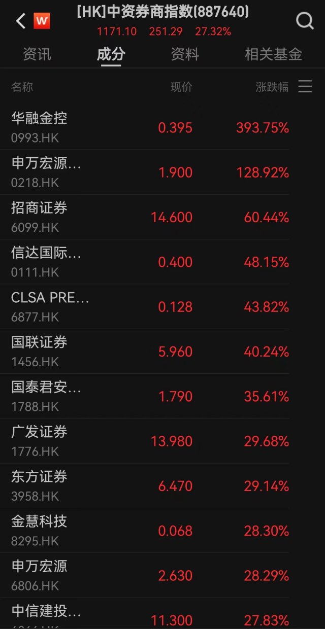 港股中资券商股涨幅扩大,华融金控涨近400%,申万宏源香港大涨128%,招商证券大涨超46%,国泰君安国际、恒投证券、兴证国际涨超30%,中信证券涨超27%。
