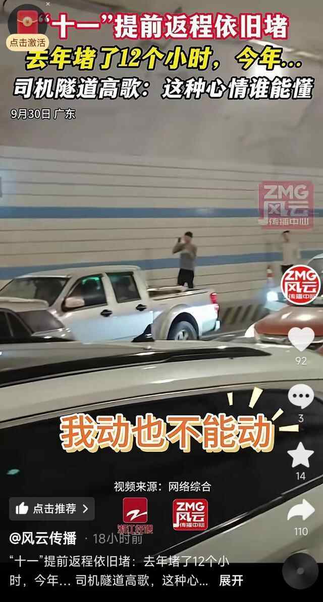一条热传视频显示,9月30日,广东一处公路隧道里车辆分成3排,堵成长龙,不少人纷纷下车,在路边休息。有男子在隧道里放声高歌。视频所配音乐,是网友们经常刷到的“我动也不能动,我退也不能退”。