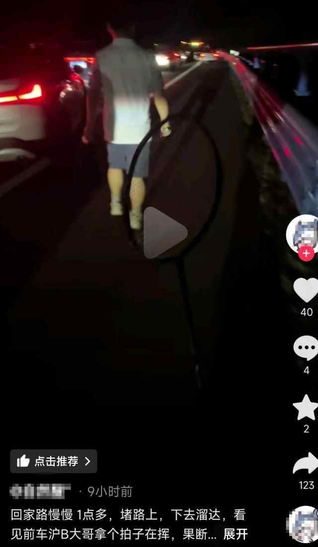 10月1日凌晨2点左右,一名IP地址显示为浙江的网友发布现场视频称,国庆回家“路慢慢”,堵路上。他下去溜达时,看见前车的沪B(车牌号)大哥正拿着拍子(羽毛球)在挥。于是果断拿出球拍与大哥切磋。