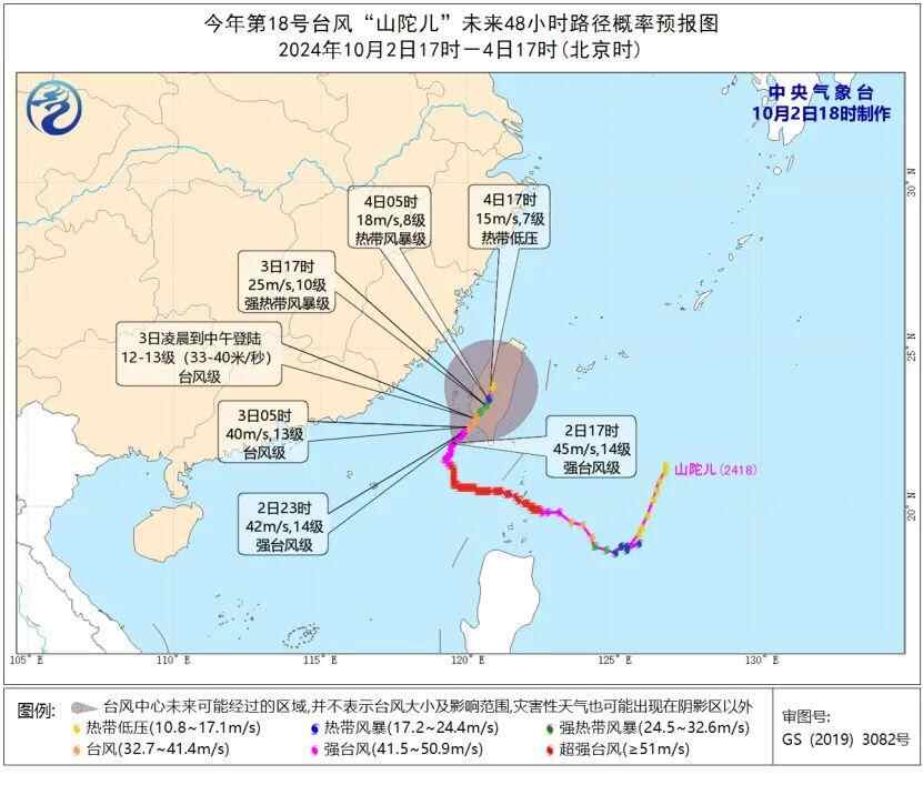 最后来看看今年第18号台风“山陀儿”,经过冷空气“削弱”后,下午已减弱为强台风级,预计“山陀儿”将在明天凌晨到中午在台湾岛登陆,之后将穿过台湾岛,今晚仍将是风雨最猛烈时段,3日夜间开始,台湾岛降雨显著减弱。