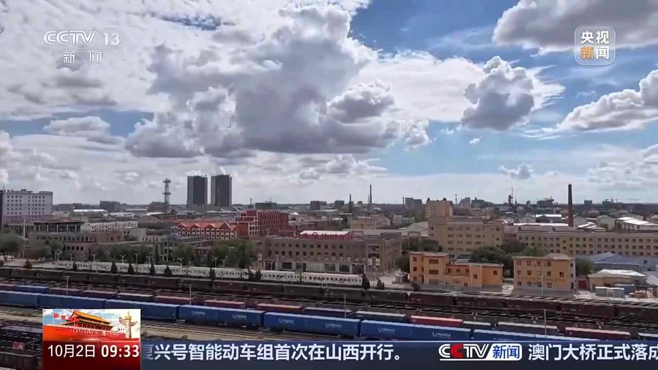 二连浩特公路口岸,等待通关的车辆排起长队,准备前往各大国际物流园区;铁路口岸,中欧班列在国门下穿梭往来,连接蒙古国、波兰、德国等10多个国家70多个站点。